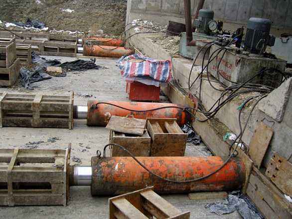 通過中間的小千斤頂的伸動作推動外套往前伸出,外套向前推動管節一段距離。